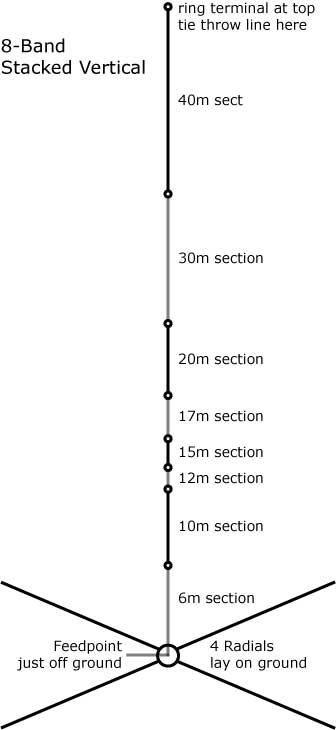 TIP: Because of the overall height, this antenna is not practical for 80m and lower bands because it would be too long. I can throw my arborist weight over a limb 35 feet up, so that limits my stacked vertical to 40m and higher bands. |